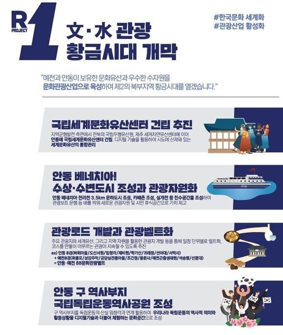김 후보는 세부 공약으로 △국립세계문화유산센터 건립 추진 △수상·수변도시 조성 및 관광 자원화 △관광 로드 개발 및 관광 벨트화 △안동 구 역사부지 국립독립운동역사공원 조성 등을 내세웠다.