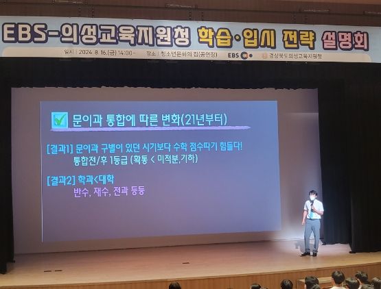 이번 설명회는 EBS의 대표 강사를 초청, 관내 학생들에게 수학 학습에 대한 전략과 복잡한 입시에서 지역의 강점을 살릴 수 있는 전략을 알아보는 기회를 제공하고자 의성교육지원청에서 EBS에 신청․선정되어 실시됐다.