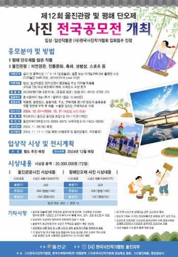 이번 공모주제는‘대한민국의 숨’이 담긴 관광지와 울진군의 대표적 민속축제인 평해단오제이며, 공모전을 통해 울진의 다양한 관광명소를 발굴하고 단오제만의 차별화된 볼거리를 널리 알려 관광객 유치를 위한 홍보 마케팅 자료로 활용될 예정이다.
