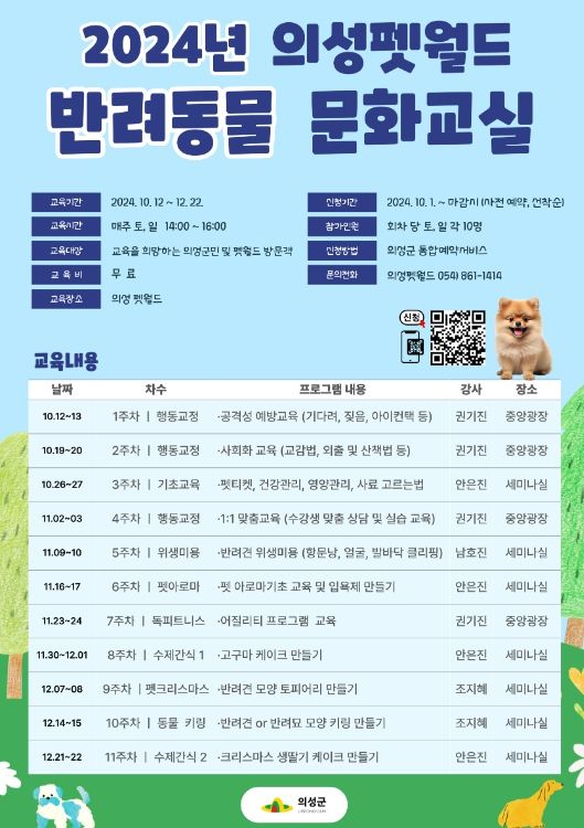 2024년 반려동물 문화교실 수강생 모집은 10월 1일부터 선착순 마감까지 모집할 예정이며 의성군 통합예약 시스템에서 예약이 가능하다.