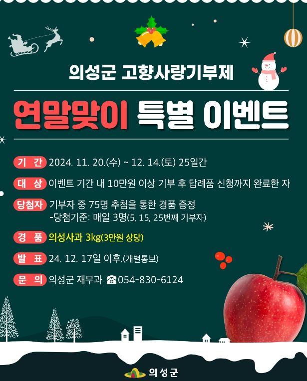 디지타임즈(DGTIMEZ) 김대경 기자 | 의성군은 오는 11월 20일부터 12월 14일까지 25일간 고향사랑기부제 연말맞이 특별 이벤트를 진행한다.