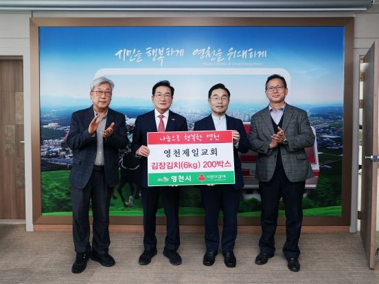 디지타임즈(DGTIMEZ) 최신형 기자 | 영천시(시장 최기문)는 6일 영천제일교회에서 김장김치 200박스(1,000만원상당), 미래약선에서 홍화씨·호두유 40세트(100만원 상당), 농업회사법인 ㈜푸른에서 계란 1,000판(700만원 상당)을 전달했다고 밝혔다.