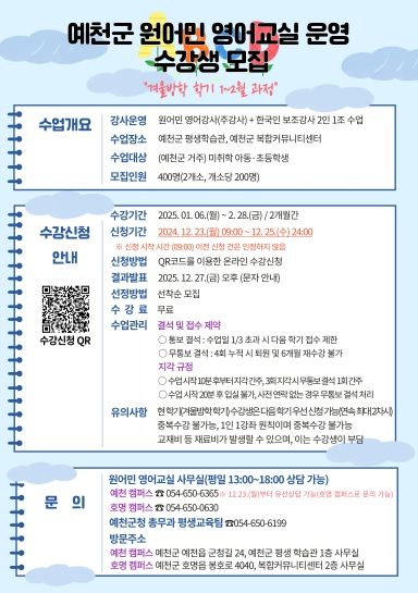 디지타임즈(DGTIMEZ) 김대경 기자 | 예천군은 지난 10월부터 3개월간 진행한 원어민 영어교실 시범운영을 성공적으로 마무리하고, 2025년 본사업 추진을 위한 수강생 모집을 시작한다고 밝혔다.