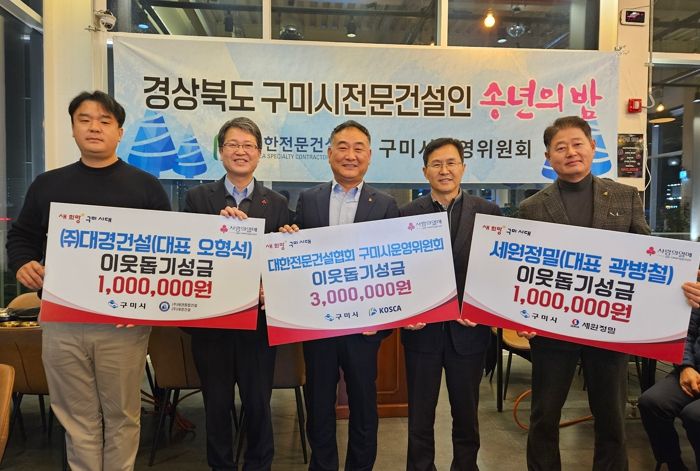 곽병철 대한전문건설협회 구미시협회장은 “힘든 상황 속에서도 구미시 이웃들이 따뜻한 겨울을 보내길 바라는 마음으로 성금을 기탁했다”며 “앞으로도 꾸준한 기부와 사회 공헌 활동으로 지역사회와 함께 성장하고, 지역 건설산업 발전에 기여하겠다”고 밝혔다.