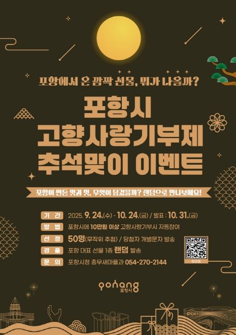 디지타임즈(DGTIMEZ) 이강옥 기자 | 포항시는 오는 24일부터 10월 24일까지 ‘추석맞이 고향사랑기부제 특별 이벤트’를 진행한다.