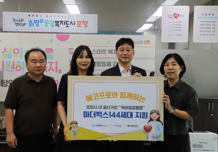 디지타임즈(DGTIMEZ) 이강옥 기자 | 포항시는 지난 25일 에코프로가 시청을 방문해 저출산 극복에 힘을 보태고, 지역 내 저소득 출산 가정을 지원하기 위해 ‘마더박스’ 144세트(3,600만 원 상당)를 기탁했다고 밝혔다.