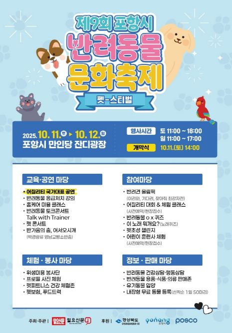 디지타임즈(DGTIMEZ) 이강옥 기자 | 포항시는 오는 10월 11일부터 12일까지 만인당 잔디광장에서 ‘제9회 포항시 반려동물 문화축제’를 개최한다.