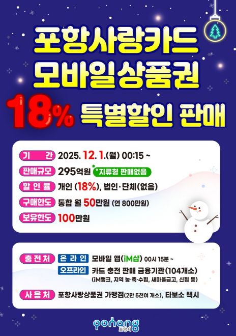 디지타임즈(DGTIMEZ) 이강옥 기자 | 포항시는 연말 지역 소비 촉진을 위해 내달 1일부터 카드형·모바일 포항사랑상품권(이하 포항사랑카드)을 295억 원 규모로 18% 할인 판매한다.