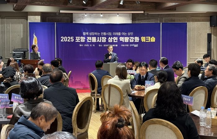 디지타임즈(DGTIMEZ) 이강옥 기자 | 포항시는 지난 19일 포마레웨딩컨벤션에서 서재원 포항시 정무특보, 임주희 포항시의회 경제산업위원장을 비롯해 지역 전통시장 상인회 임원 등 관계자 100여 명이 참석한 가운데 2025년 ‘포항시 전통시장 상인 역량강화 워크숍’을 개최했다.