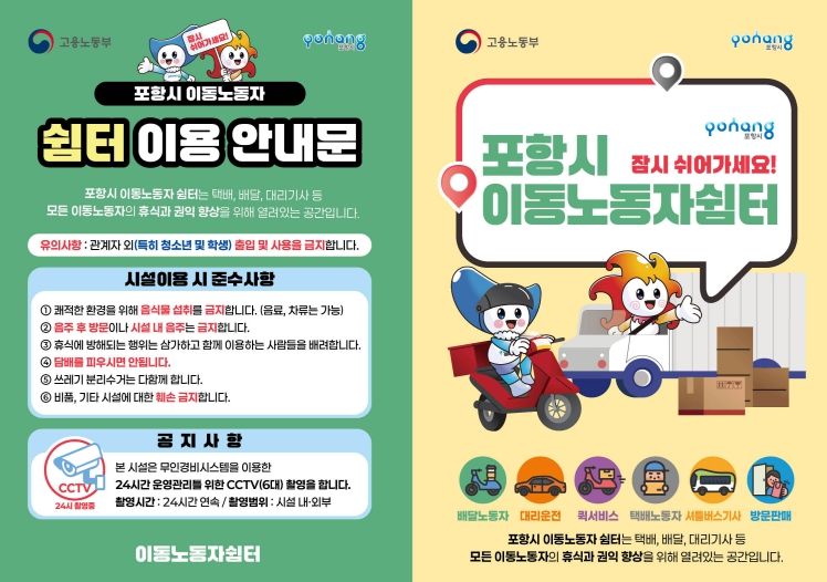 포항시 관계자는 “이동노동자 쉼터가 현장에서 땀 흘리는 노동자들에게 든든한 휴식처가 되길 바란다”며 “앞으로도 플랫폼 노동자를 비롯한 노동약자들이 존중받는 근로 환경을 조성하기 위해 정책적 지원을 확대해 나가겠다”고 말했다.