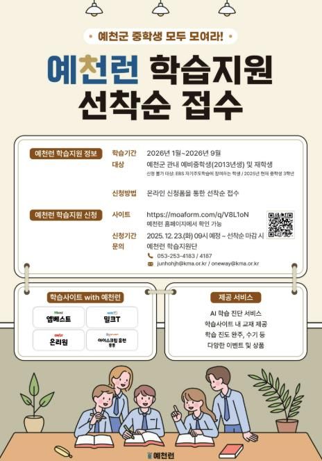이번 추가 모집은 23일 오전 9시부터 선착순 접수로 진행되며, 대상은 예천군 관내 예비 중학교 1학년(현 초등학교 6학년)과 재학생(현 중학교 1·2학년)이다.
