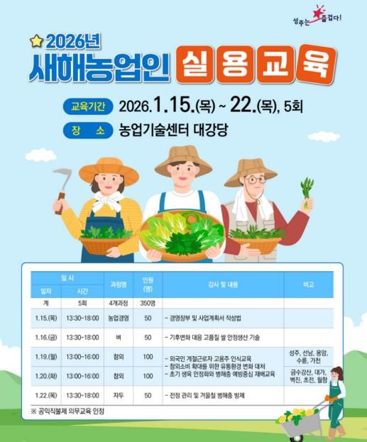 대경타임즈 김대경 기자 | 성주군은 오는 1월 15일부터 22일까지 농업기술센터 대강당에서 지역 농업인 350여명을 대상으로 '2026년 새해농업인실용교육'을 실시한다.