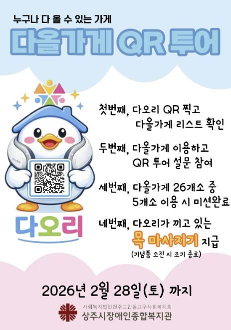 대경타임즈 최신형 기자 | 상주시장애인종합복지관은 1월 2일부터 2월 28일까지 지역 내 무장애 상가 이용을 활성화하기 위한‘다올가게 QR 투어’ 캠페인을 진행한다.