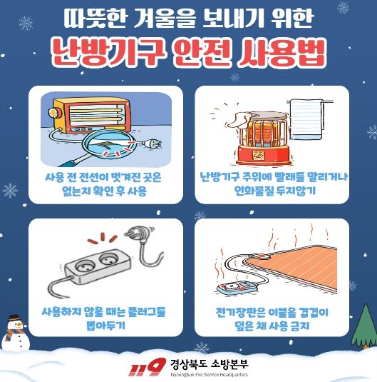 이에 따라, 경상북도 소방본부는 겨울철 화재 발생 예방을 위하여 다음과 같은 유의 사항을 도민들에게 당부했다.