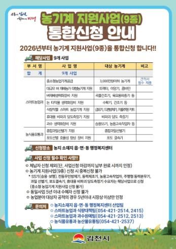 대경타임즈 김대경 기자 | 김천시는 지역 농업인을 대상으로 ‘2026년 농기계 지원사업(9종)’ 신청을 오는 2026년 1월 30일(금)까지 농지소재지 읍면동 행정복지센터에서 접수한다고 밝혔다.
