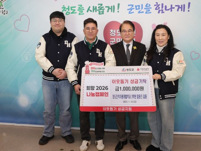 대경타임즈 이강옥 기자 | 대구한의대학교 청도인적자원개발학과 3학년 임원진들(과대표 조형석)은 지난 16일 희망2026 나눔캠페인 이웃돕기 성금 100만원을 청도군에 전달했다.