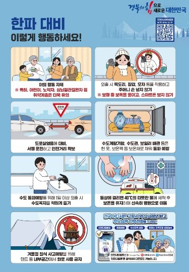 김종수 경상북도 안전행정실장은 “이번 한파에 대한 도민 피해와 불편이 최소화하도록 취약계층 관리, 시설물 안전조치 등 안전대책을 추진”해 줄 것을 강조하면서“도민 여러분께서도 한파로 인한 피해 예방을 위해 국민 행동 요령을 반드시 지켜 주실 것”을 당부했다.