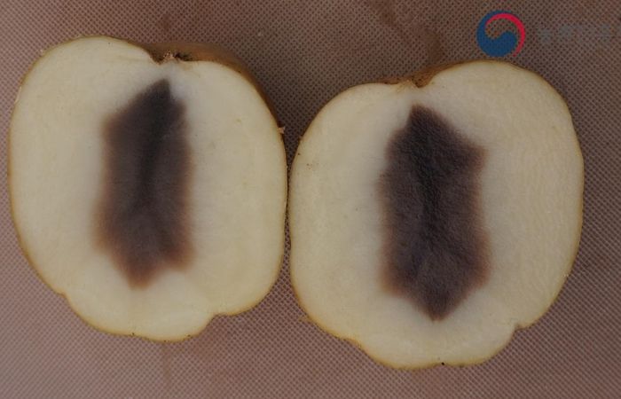 ‘흑색심부병’은 감자를 밀폐된 상태에서 장기간 저장할 경우 공기순환이 원활하지 않아 발생하는 생리장해로, 특히 저장 중 온도가 0℃ 이하의 저온이거나 25℃ 이상의 고온 조건일 때 발생 가능성이 높아진다.