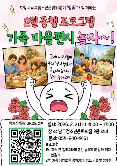 대경타임즈 이강옥 기자 | 포항시청소년재단 남구청소년문화의집은 오는 21일 토요일 청소년 및 남구 지역 주민들을 위한 동행 2월 프로그램 ‘가족 마음 편지 놀자’를 진행하고 참가자를 모집한다.