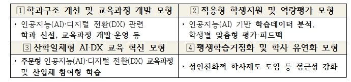 각 참여 대학은 지역 산업과 대학별 강점을 결합한 ‘인공지능(AI)·디지털 전환(DX) 특화 모형’을 구축한다. 대학별로 ▲학과구조 개선, ▲데이터 기반 학생 지원, ▲산학협력 교육, ▲학사제도 유연화 등 필요한 모형을 자유롭게 선택할 수 있다. 또한, 경진대회·공모전 개최로 우수 사례를 발굴·공유하면서, 전문대학 전반의 인공지능(AI)·디지털 전환(DX)을 이끌어갈 계획이다.
