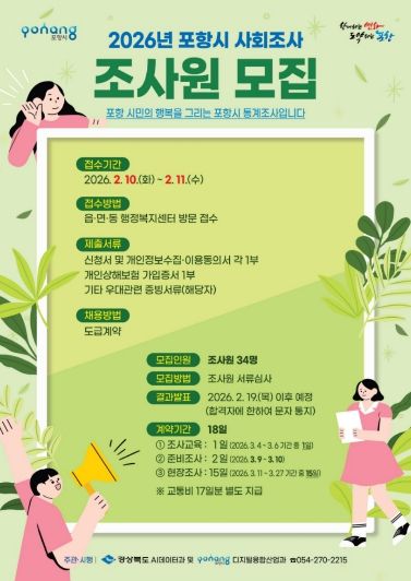대경타임즈 이강옥 기자 | 포항시는 ‘2026년 경상북도 및 포항시 사회조사’에 참여할 조사원 34명을 모집한다.