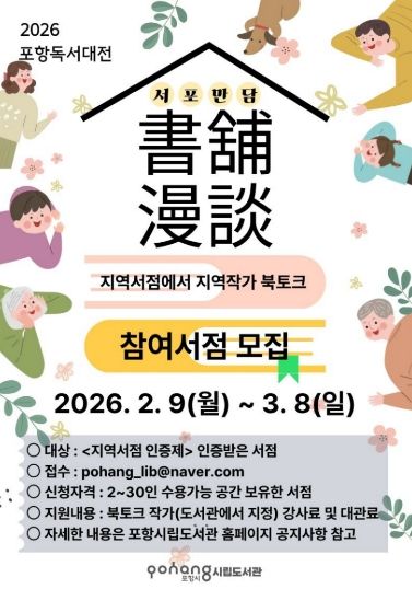 대경타임즈 이강옥 기자 | 포항시는 오는 9일부터 내달 8일까지 ‘2026 포항독서대전’ 연간 프로그램인 ‘서포만담(書舖漫談)’에 참여할 지역 서점을 모집한다.