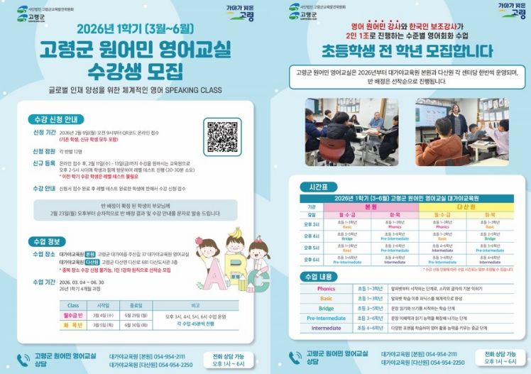 대경타임즈 김대경 기자 | 사)고령군교육발전위원회(이사장 성현덕)는 고령군 초등학생을 대상으로 영어 의사소통 능력 향상과 국제적 감각 함양을 위해 ‘2026년 고령군 원어민 영어교실’ 1학기 과정을 운영한다.
