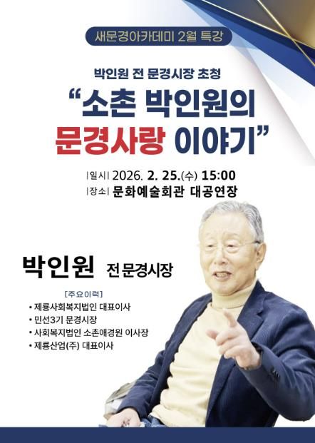 이번 특강은 박인원 전 문경시장을 초청하여 '소촌 박인원의 문경사랑 이야기'를 주제로 진행되며, 대담 형식으로 운영된다.