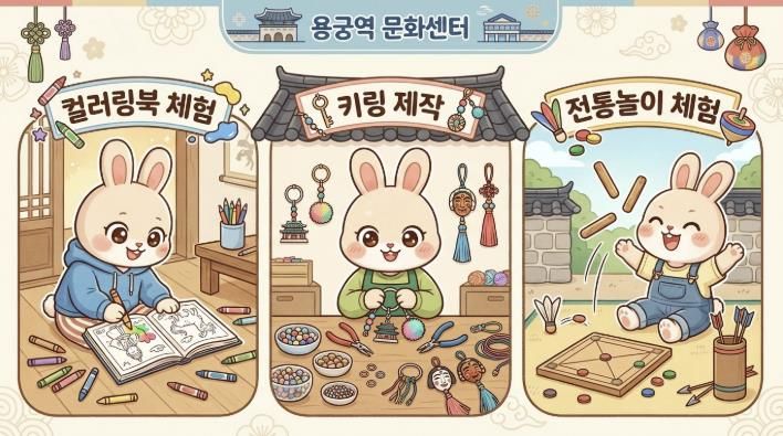 공간별 특색을 살린 체험 프로그램도 눈길을 끈다. 용궁역사 내에서는 오전 10시부터 오후 5시까지 창의력을 발휘할 수 있는 컬러링북 및 키링 만들기 체험이 상시 운영되며, 야외 테마공원에서는 투호, 제기차기, 고리 던지기 등 전 세대가 함께 즐길 수 있는 전통 놀이 체험 공간이 마련돼 활기찬 분위기를 더할 예정이다.