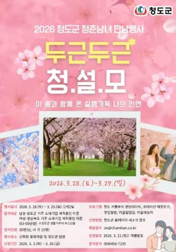 대경타임즈 이강옥 기자 | 경북 청도군은 다가오는 봄을 맞아 바쁜 직장 생활로 인연을 만날 기회가 부족했던 청년들을 위해, 아름다운 청도 관광 명소를 여행하며 자연스럽게 인연을 찾는 미혼남녀 만남행사‘청(도)설(렘)모(임) 프로젝트’를 개최하고 참가자를 모집한다고 밝혔다.