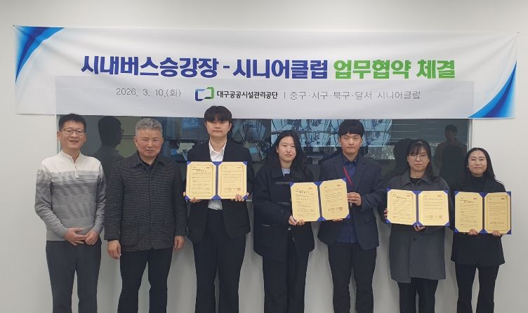 대경타임즈 최영 기자 | 대구공공시설관리공단(이사장 문기봉) 시내버스유개승강장은 지난 3월 10일(화), 시내버스유개승강장 사무실에서 지역 4개 시니어클럽과 업무협약을 체결했다.