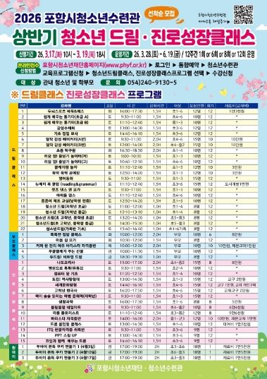 대경타임즈 이강옥 기자 | 포항시청소년재단 청소년수련관은 청소년들의 흥미와 적성을 발견하고 진로 역량을 강화하기 위한 ‘2026년 상반기 청소년 드림·진로성장 클래스’ 수강생을 모집한다.