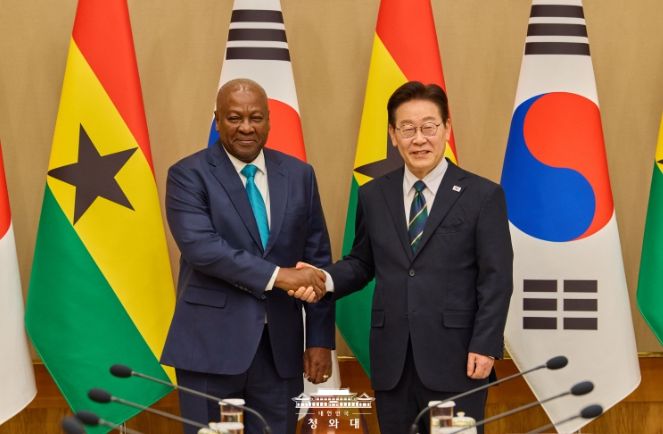 대경타임즈 이강옥 기자 | 이재명 대통령은 11일 오후 우리나라를 실무 방한한 존 드라마니 마하마 가나 대통령과 정상회담을 가졌다고 강유정 청와대 대변인이 서면 브리핑을 통해 밝혔다.