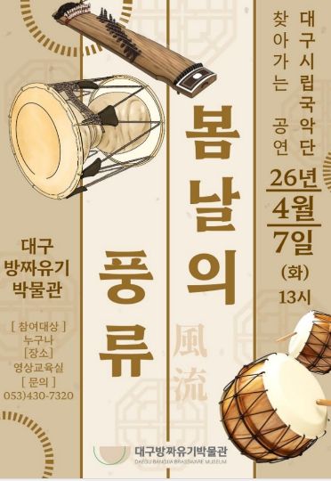 대경타임즈 최영 기자 | 대구문화예술진흥원 박물관운영본부 소속 대구방짜유기박물관은 봄날에 팔공산 역사문화 특강과 국악 공연을 기획해 3월 24일 오후 2시에 ‘탁본자료로 만나는 팔공산 역사문화 깊이’를, 4월 7일 오후 1시에 대구시립국악단 찾아가는 공연 ‘봄날의 풍류’를 개최한다.