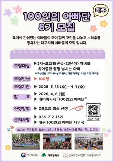 대경타임즈 최영 기자 | 대구광역시는 아빠들의 적극적인 육아 참여를 독려하고 함께 육아하는 사회 분위기를 확산하기 위해 3월 18일부터 ‘2026년 제8기 대구 100인의 아빠단’ 활동 단원을 모집한다.