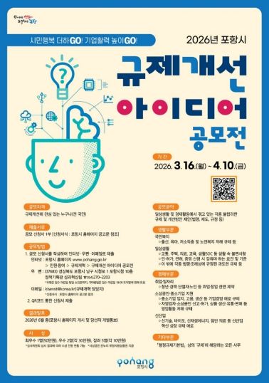 대경타임즈 이강옥 기자 | 포항시는 일상생활과 경제활동에 불편을 주는 불합리한 규제를 시민과 함께 발굴하고 개선하기 위해 3월 16일부터 4월 10일까지 ‘2026년 포항시 규제개선 아이디어 공모전’을 개최한다.