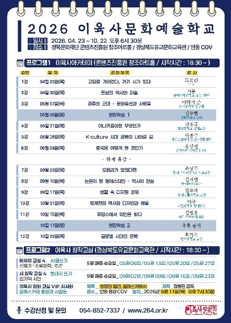 대경타임즈 김완태 기자 | 안동시 이육사문학관은 4월 23일부터 '2026 이육사문화예술학교'를 개강한다. '2026 이육사문화예술학교'는 국내외 저명 강사들이 참여해 인문․예술 전반의 다양한 주제를 다루며, 시민이 일상에서 인문학의 깊이를 체감할 수 있도록 풍성하고 내실 있는 강연으로 운영된다.