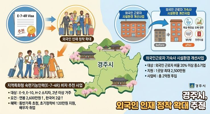 대경타임즈 최신형 기자 | 경주시는 외국인 인재 정착을 확대하기 위해 ‘지역특화형 숙련기능인력(E-7-4R) 비자 추천 사업’과 ‘외국인 근로자 기숙사 시설환경 개선사업’을 추진한다고 19일 밝혔다.