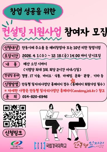 신청 대상은 안동시에 주소를 둔 예비창업자 또는 10년 미만 창업기업으로, 12월 18일까지 상시 모집한다. 기업당 최대 3회까지 가능하다.