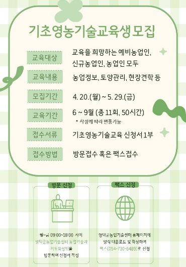 모집 기간은 다음 달 29일까지이며, 교육 신청을 희망하는 교육생들은 영덕군농업기술센터 농업기술과 지도육성팀을 방문하거나 팩스로 접수할 수 있다.