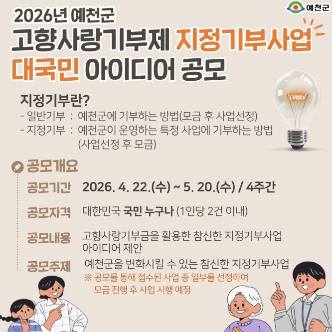 대경타임즈 김대경 기자 | 예천군은 기부자가 사업 목적에 공감하고 직접 수혜 대상을 결정하는 ‘고향사랑 지정기부제’를 적극 도입하기로 하고, 그 첫걸음으로 4월 22일부터 5월 20일까지 '2026년 예천군 고향사랑기부제 지정기부사업 아이디어 공모전'을 열어 국민들의 참신한 제안을 받는다.