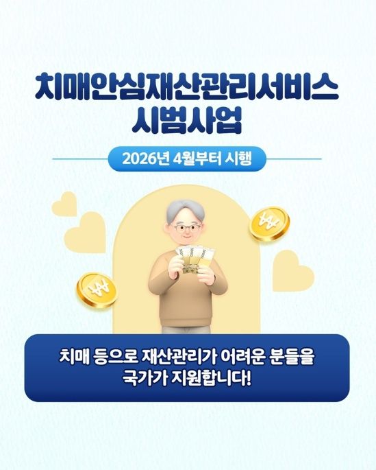 치매 등으로 스스로 재산관리가 어려운 어르신이 본인 의사에 따라 요양비, 병원비, 생활에 필요한 물품 및 서비스 비용이 적절히 지출될 수 있도록 지원하는 공공서비스