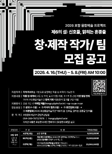 한편, 공모 접수는 5월 8일 오전 10시까지 이메일로 진행되며, 자세한 사항은 포항문화포털 공모참여 게시판을 통해 확인할 수 있다.