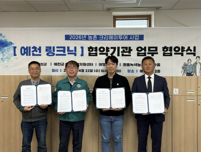 대경타임즈 김대경 기자 | 예천군은 지난 22일 오후 4시, ‘농촌 크리에이투어’ 사업의 체계적인 추진과 민·관 협력 강화를 위한 민간 협의체를 구성하고 업무 협약을 체결했다고 밝혔다.