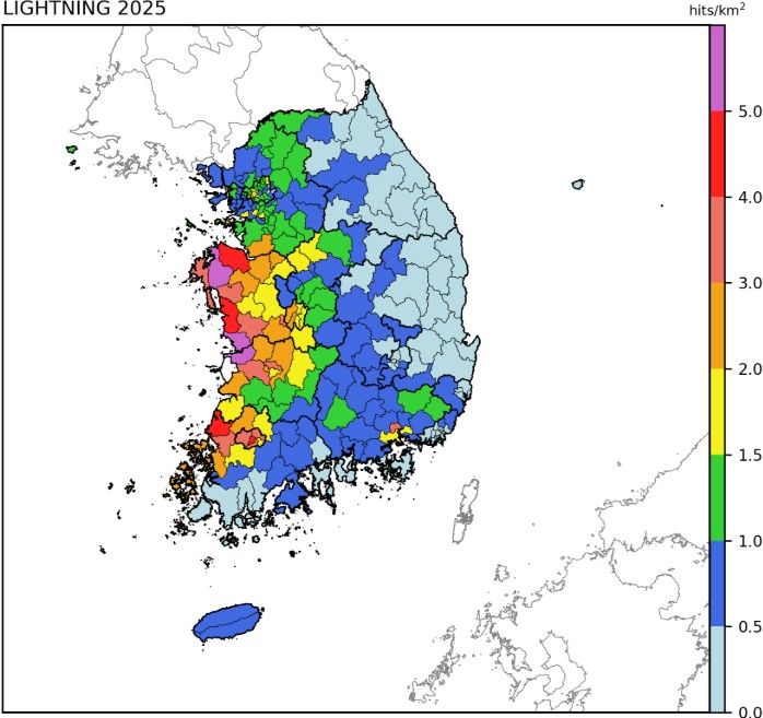 대경타임즈 김대경 기자 | 기상청은 2025년 우리나라에서 관측된 낙뢰 정보를 담은 ‘2025 낙뢰연보’를 발간했다. 연보는 기상청 21개 낙뢰 관측망으로 관측한 자료를 통해 분석한 △월별, 광역시·도별, 시군구별 낙뢰 횟수 △단위 면적당(㎢) 횟수 △낙뢰 공간 분포 △주요 5대 낙뢰 사례 등의 내용을 담고 있다.