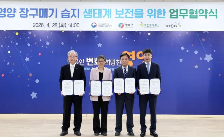 대경타임즈 김완태 기자 | 영양군은 대구지방환경청, 국립생태원, ㈜KT&G와 4월 28일, 영양 장구메기 습지 생태계 보전을 위한 업무협약을 체결했다.