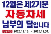 디지타임즈(DGTIMEZ) 김완태 기자 | 안동시는 2025년도 제2기분 자동차세 40,428건, 62억 7천만 원을 부과하고 고지서를 발송했다고 12월 18일(목) 밝혔다. 12월 1일 현재 자동차등록원부상 소유자에게 부과된 이번 자동차세의 납부 기간은 12월 16일부터 12월 31일까지며, 연납신청으로 자동차세를 이미 납부한 차량 및 6월에 납부한 연세액 10만 원 이하인 차량은 이번 부과대상에서 제외된다. 하반기 중 신차를 구입하거나 중고차를 이전받아 등록한 경우에는, 취득일부터 12월 말까지 소유한 기간에 대해 일할 계산된 금액을 납부하면 된다. 자동차세 연납은 매년 1․3․6․9월에 신청할 수 있으며, 1월 중에 신청할 경우 4.58%의 공제를 받을 수 있고, 신청은 안동시청 세정과 및 읍면동 행정복지센터 방문 또는 전화, 위택스로 가능하다. 자동차세는 고지서에 기재된 지방세입 계좌를 통해 전국 모든 금융기관에서 이체 수수료 없이 납부할 수 있고, 지로 및 현금인출기 납부, 위택스 등을 통한 전자납부도 가능하다. 안동시 관계자는 “우편으로 발송된 고지서를 반드시 확인하시고 가산금, 차량 압