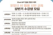 대경타임즈 이강옥 기자 | 포항시는 지난해 시민들로부터 큰 호응을 얻었던 ‘생성형 AI 활용 콘텐츠 제작 특강’을 올해도 정규 편성하고, 오는 23일부터 2026년도 상반기(1·2기) 수강생을 모집한다. 이번 특강은 ChatGPT를 활용한 생성형 AI를 실생활과 업무에 즉각적으로 활용할 수 있는 실질적인 학습 기회를 제공하기 위해 마련됐다. 지난해 실시된 특강이 시민들로부터 높은 관심과 만족도를 기록함에 따라, 시는 총 6기에 걸쳐 확대 운영할 계획이다. 이번 모집은 그중 상반기에 시작되는 1기와 2기를 대상으로 진행된다. 교육은 기수별로 4주 동안 주 1회(회당 2시간)씩 진행된다. 야간반인 1기는 3월 3일부터 24일까지 매주 화요일 오후 7시에 운영되며, 2기는 3월 9일부터 30일까지 매주 월요일 오전 10시에 시작된다. 교육 장소는 경북콘텐츠기업지원센터 5층이다. 포항시민이라면 누구나 신청 가능하며, 모집 인원은 기수별 20명씩 총 40명이다. 단, 더 많은 시민에게 교육 기회를 제공하기 위해 중복 접수는 불가능하다. 접수 기간은 오는
