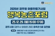 디지타임즈(DGTIMEZ) 최신형 기자 | 경주시가 오는 29일 오후 3시부터 5시까지 청內 알천홀에서 주민·전문가·행정이 함께 참여하는 ‘경주시 마을만들기 행복농촌포럼’을 개최한다. 이번 포럼은 농촌이 단순한 거주공간을 넘어 서로 돌보고 함께 살아가는 공동체의 터전이라는 인식 아래, 인구 감소와 고령화, 생활방식 변화 등으로 농촌 지역이 직면한 과제에 대응하기 위해 마련됐다. 경주시는 이번 포럼을 통해 농촌지역 활성화 전략과 마을만들기 추진체계의 의미 있는 미래 방향이 폭넓게 논의될 것으로 기대하고 있다. 행복농촌포럼은 경주시 마을만들기 정책 방향 발표를 시작으로 전문가 초청 주제 특강, 우수사례 발표와 질의응답 등으로 구성된다. 특히 2026년부터 단계적으로 추진될 ‘경주형 마을만들기 사업’의 주요 변경 사항과 추진체계 개편 방향을 집중적으로 다룰 계획이다. 주낙영 경주시장은 “그간 농촌공간정비사업과 기초생활거점사업, 농촌중심지 활성화사업 등 다양한 농촌개발 사업을 추진해왔다”며 “이번 포럼을 계기로 지역별 특성에 기반한 맞춤형 농촌 발전 전략을 더욱 강화해 나가겠다”고 말했다.