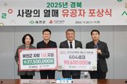 디지타임즈(DGTIMEZ) 김대경 기자 | 예천군은 26일 오전, 경북사회복지공동모금회(회장 전우헌)가 주최하는 ‘2025 경상북도 찾아가는 이웃돕기 유공자 포상식’이 예천군청에서 열렸다고 밝혔다. 이번 행사는 희망 2025 나눔캠페인과 나눔 및 선행문화 확산에 기여한 개인 및 나눔봉사단의 공로를 기리고 격려하기 위해 마련됐다. 이날 행사에서 나눔·봉사를 실천한 공로로 사회복지공동모금회장 표창에 학가산 전통메주마을 박상지 대표, 기부와 선행을 실천한 공로로 경북도지사표창에 해인종합상사 황지훈 대표, 최우수 봉사단에 예천군 사랑의열매 나눔봉사단이 선정됐다. 아울러 봉사단 활동에 활발히 참여해 준 김종순 사무국장과 박승용 단원에 사회복지공동모금회장 표창을 수여했다. 예천군 사랑의열매 나눔봉사단은 ‘희망2025나눔캠페인’에서 약 5억 8천만 원의 이웃돕기 성금을 모금했으며, 착한가게 영입, 나눔리더 발굴 등 따뜻한 나눔문화 확산에 앞장선 결과 2년 연속 최우수 봉사단으로 선정될 수 있었다. 경북사회복지공동모금회 손병일 사무처장은 “한해 동안 열심히 활동 해 주신 예천군 사랑의 열매 나눔봉사단에 감사드리